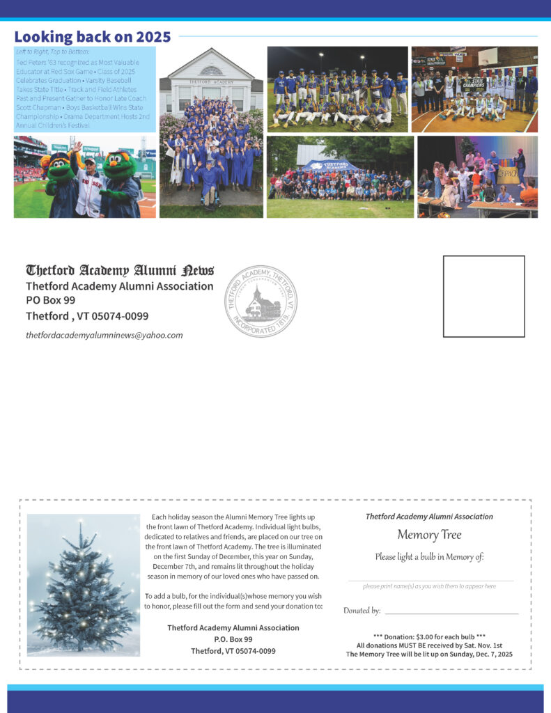 The Thetford Academy Alumni Association recently published their fall newsletter, sharing alumni news and events. Coming right up on November 22, TAAA will host the annual Holiday Craft Bazaar in the Vaughan Alumni Gymnasium. Donations are still needed for the Alumni Craft Table, a great place to share your crafts, handiwork, or baked goods and give back to TA at the same time.