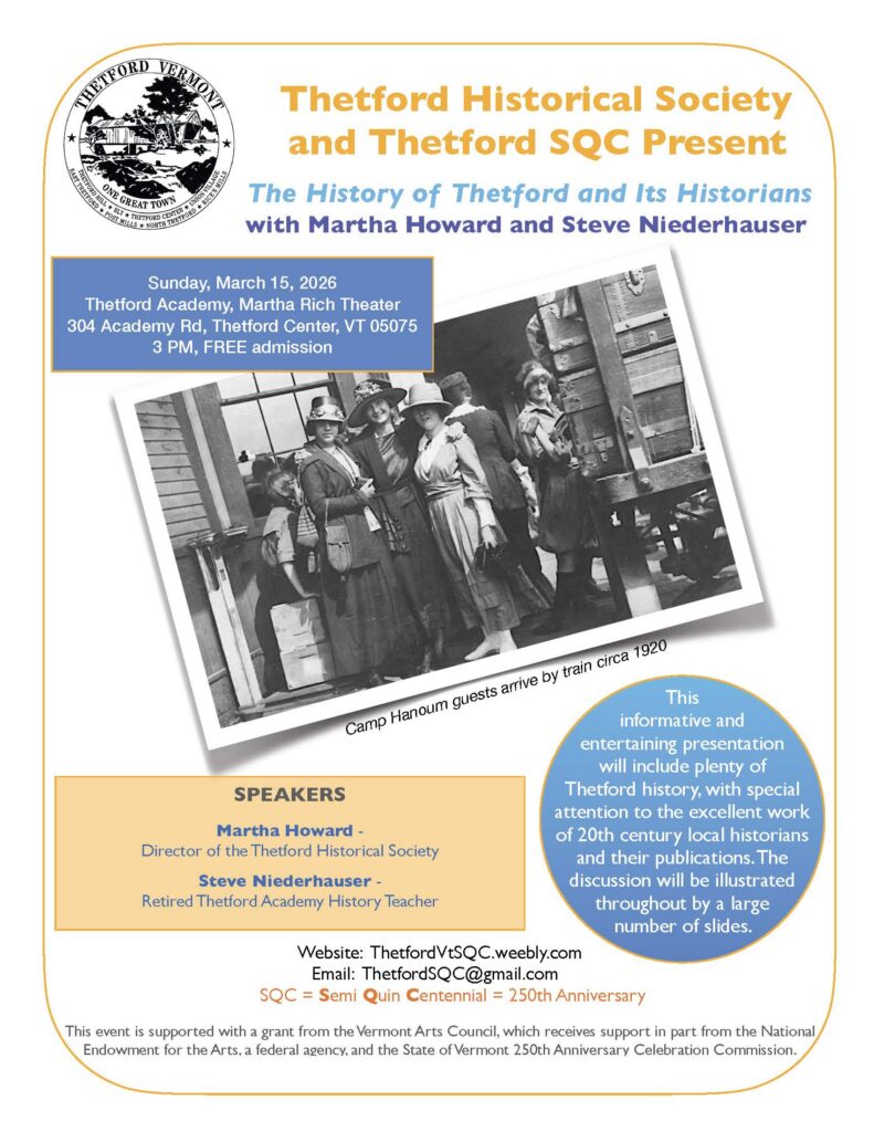 The Thetford Historical Society (THS) and the Thetford Semiquincentennial Committee (SQC) are excited to present “The History of Thetford and its Historians” this Sunday, March 15 at 3 p.m. in Thetford Academy’s Martha Jane Rich Theater.